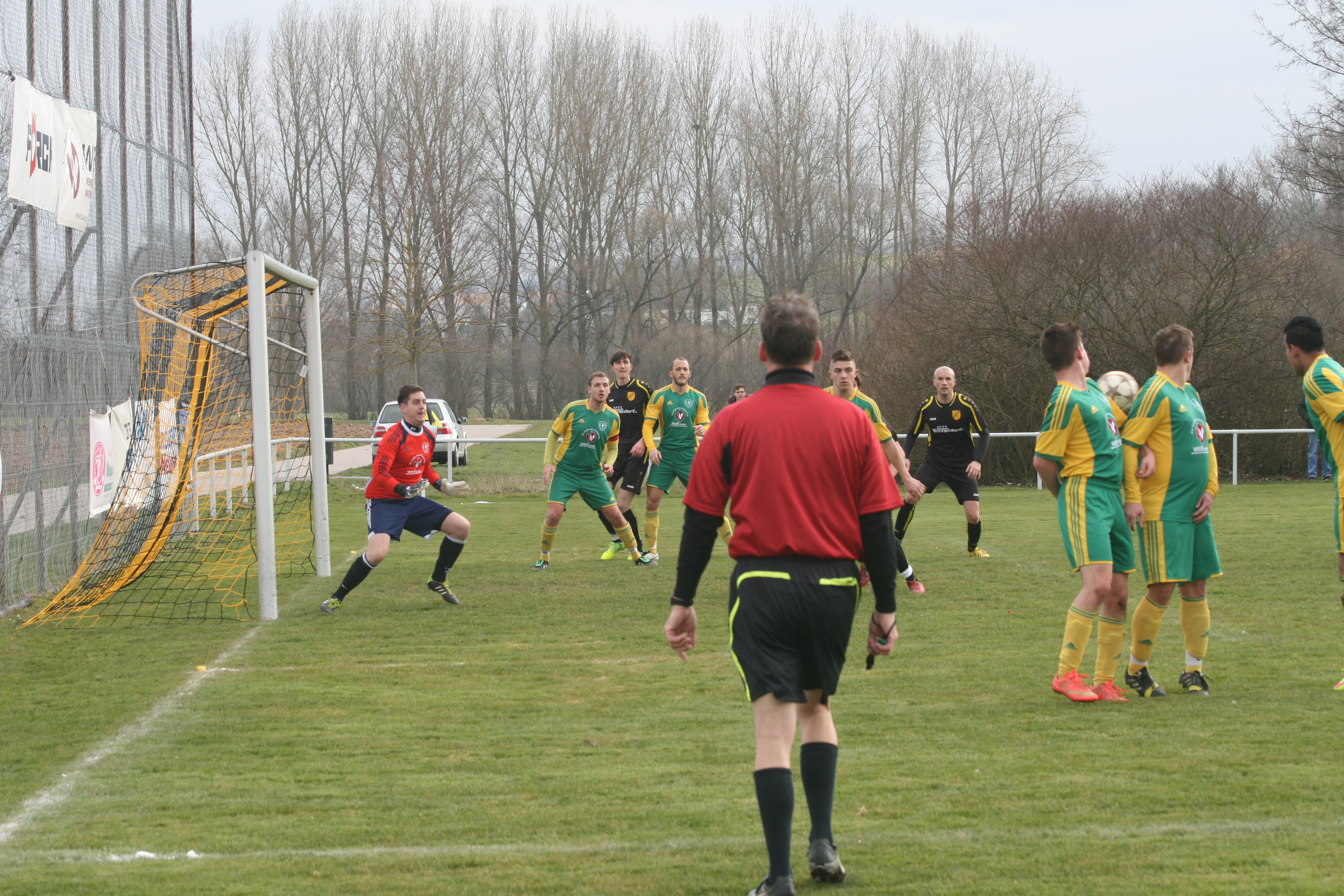 Bereits nach einer Minute klingelte es auch für mich völlig überraschend im Gehäuse der Gäste, weshalb ich mir im Anschluss den Treffer von Interims-Stadionsprecher Jan Trabold erklären lassen musste. Das Tor fiel wie folgt: Freistoß Hans-Michael Gerner, Schuss Daniel Müller, Tor Daniel Müller, 1:0 Stein. Anschließend sah man dann eine Begegnung, die aufgrund des holprigen Untergrundes kein wirklich gutes Kombinationsspiel zuließ. Die beste Gelegenheit der ersten Halbzeit hatten dann die Gäste, als ein Gästespieler plötzlich ganz allein vor Simon Käfer auftauchte. Doch mit einem tollen Reflex konnte er den Ball abwehren. Somit ging es mit einer Führung in die Pause.