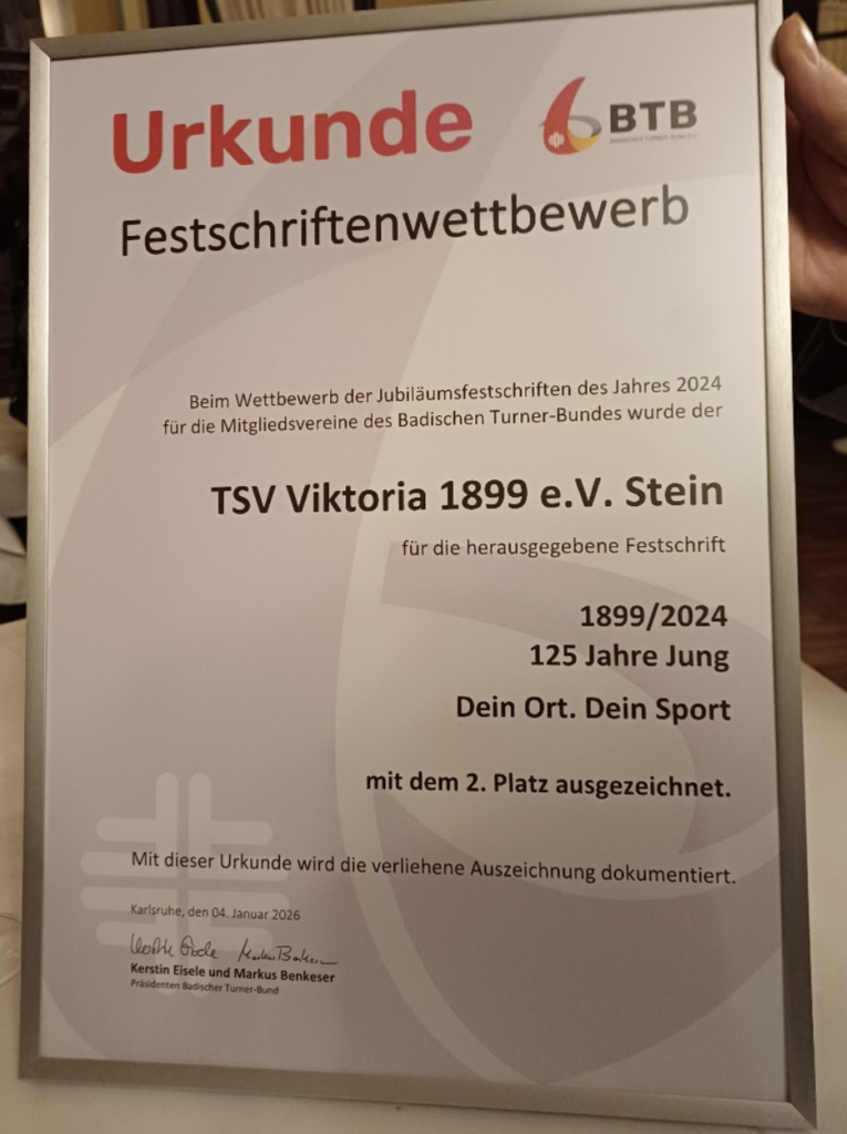 Im Juni 2025 wurde der TSV Stein vom BTB schriftlich darüber informiert, dass die Jubiläumschronik einen der ersten drei Plätze beim Wettbewerb belegt und die Preisverleihung am 04. Januar 2026 im Rahmen der Turngala „beyond limits“ im Festspielhaus Baden-Baden erfolgt.